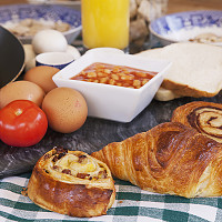 bread, butter, juice, milk, cereals, bacon, eggs, mushrooms, tomatoes, cucumber, cheese, ham and gorgeous variety of frozen croissants waiting for you to bake.